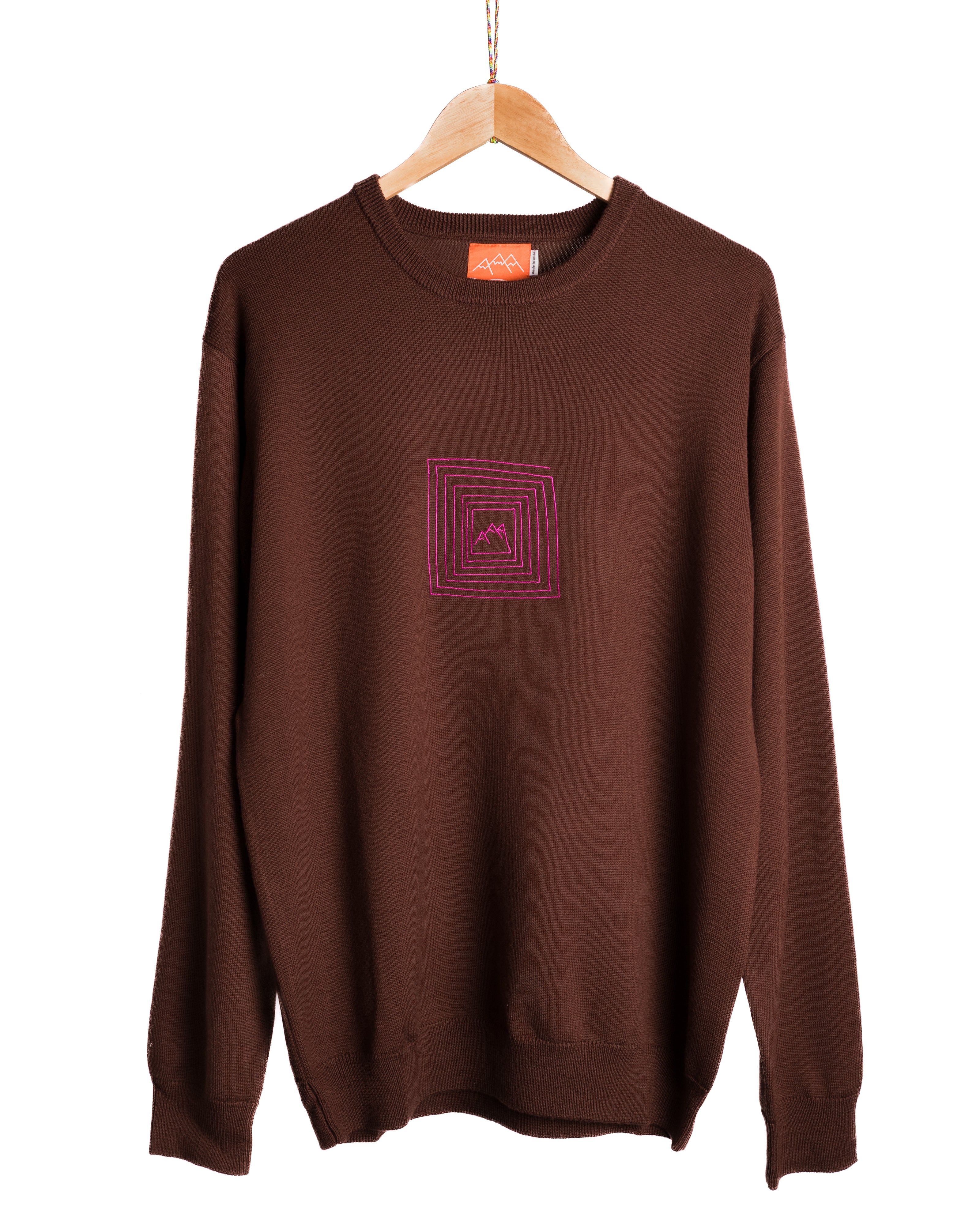 The brown colorway features our square spiral embroidered on the chest.