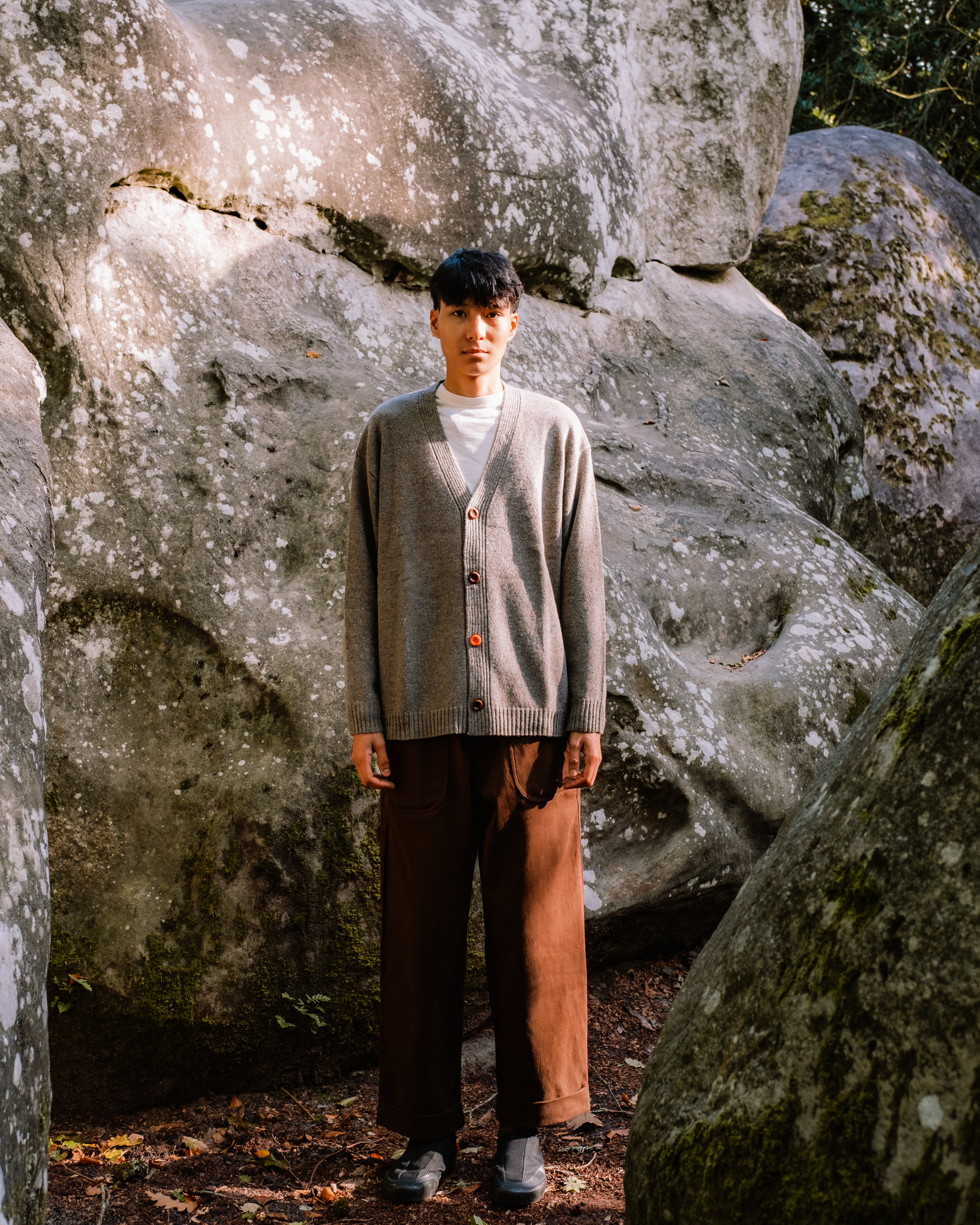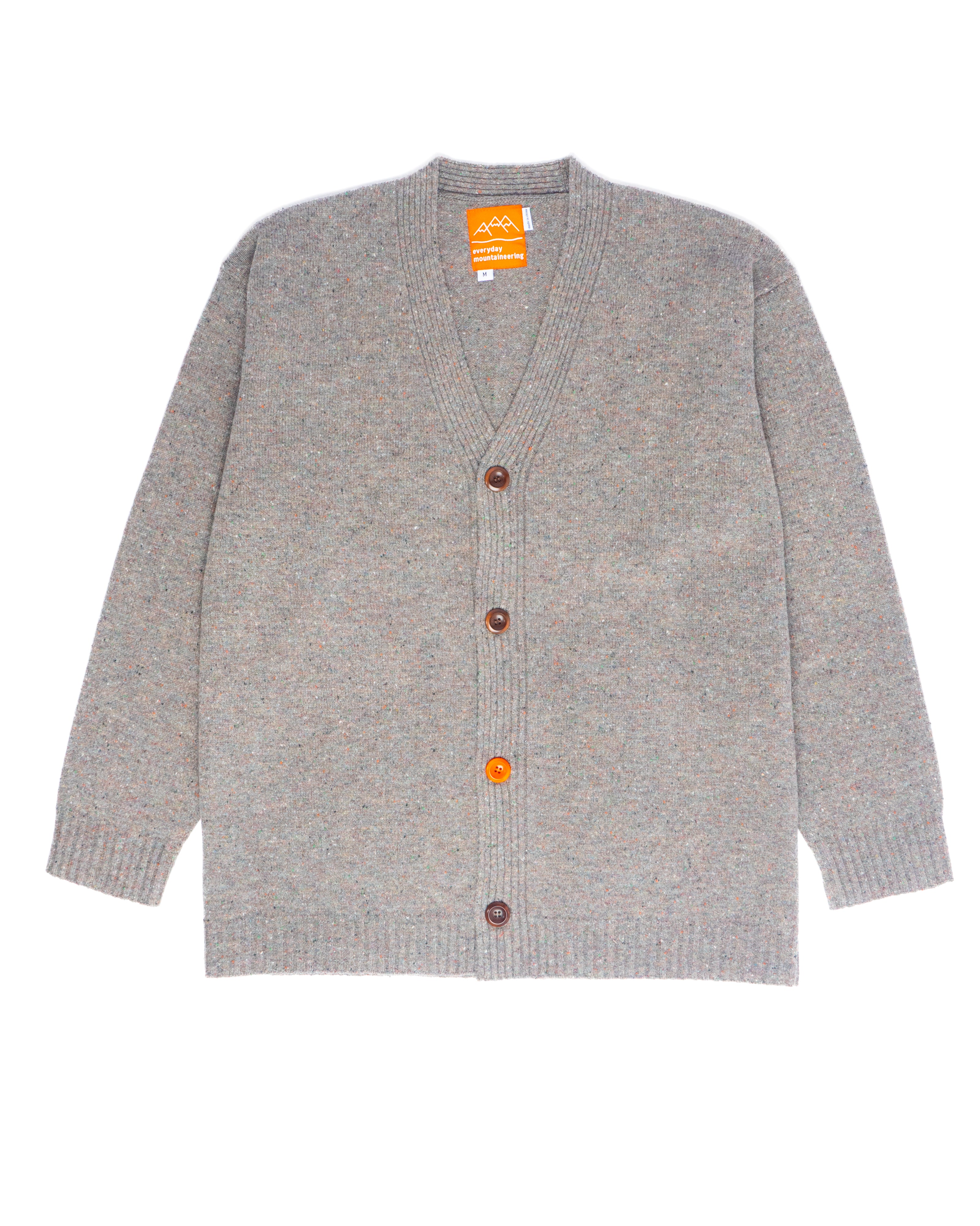 Slightly slouchy merino/cashmere blend cardigan, with a contrasting orange button.